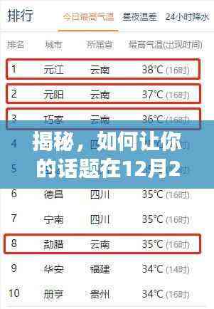 随着互联网的普及和社交媒体的繁荣,越来越多的人开始关注如何让自己的话题成为热门,本文将为你揭示一些实用的方法,帮助你在12月27日或其他任何时间将你的话题推上热门榜单。
