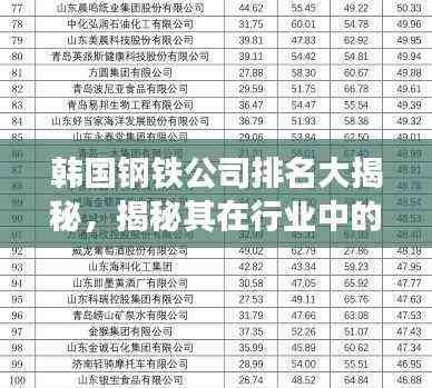 韩国,作为全球的钢铁生产大国之一,其钢铁产业在国内外享有盛名,众多优秀的钢铁公司在该国崭露头角,为全球钢铁市场贡献了巨大的价值,究竟哪些韩国钢铁公司在行业内表现突出,排名靠前呢?本文将为您揭晓答案。
