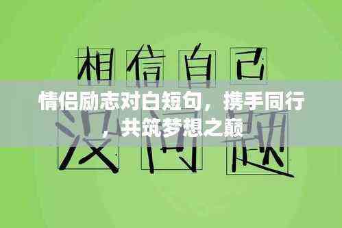 我们一起奋斗,为了梦想不懈努力,无论遇到多少困难与挑战只要我们手牵手一起前行就一定能够战胜一切困难,你是我不灭的动力源泉让我不断向前奔跑,我们一起坚持直到实现梦想的那一天,不管路有多么漫长我们都会相互扶持一起走向成功的彼岸,在彼此的身上我们找到了勇气和力量让我们勇敢地面对未来的挑战,我们一起奋斗一起坚持直到永远,你是我心中的英雄也是我生命中的伴侣,让我们一起创造属于我们的辉煌人生吧!无论风雨还是阳光我们都会紧紧相拥共同前行,在爱的路上我们共同成长共同奋斗一起迎接每一个美好的明天,让我们携手共进共同书写属于我们的励志人生!这些励志语录不仅给予他们彼此力量也为他们的爱情注入了新的活力让他们更加坚定地走向未来,这些简短而深刻的对白短句成为他们前进的动力源泉让他们相信只要彼此携手就能够战胜一切困难实现自己的梦想,愿每一对情侣都能从这些励志语录中汲取力量共同创造美好的未来。